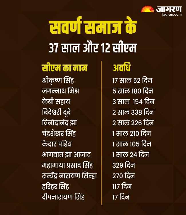 विगत 76 वर्षों में बिहार में सत्ता के शीर्ष पर सवर्ण समाज की मौजूदगी का आंकड़ा बताता है कि इस समाज के लोग 37 साल 197 दिन मुख्यमंत्री रहे, पर इनमें से केवल दो लोग ही ऐसे थे जिन्होंने पांच वर्ष से अधिक का कार्यकाल पूरा किया। शेष अधिकतम तीन वर्ष तक ही चले।