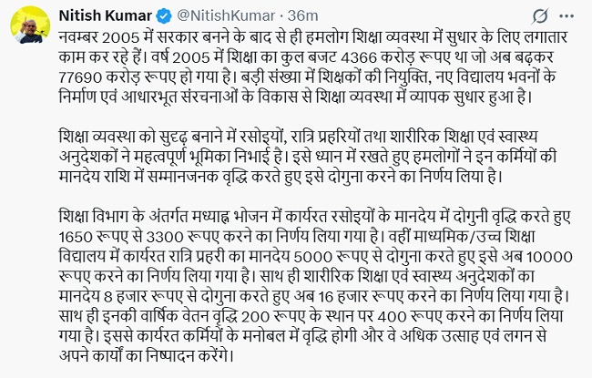 नीतीश कुमार ने आगे लिखा कि शिक्षा विभाग के अंतर्गत मध्याह्न भोजन में कार्यरत रसोइयों के मानदेय में दोगुनी वृद्धि करते हुए 1650 रुपये से 3300 रुपये करने का निर्णय लिया गया है।