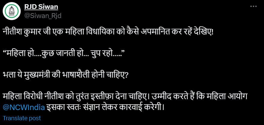 राजद ने आगे लिखा, "भला ये मुख्यमंत्री की भाषाशैली होनी चाहिए? महिला विरोधी नीतीश को तुरंत इस्तीफा देना चाहिए। उम्मीद करते हैं कि महिला आयोग इसका स्वतः संज्ञान लेकर कार्रवाई करेगी"।