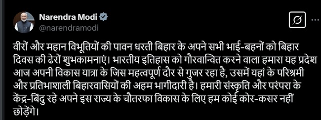 पीएम मोदी ने बिहार दिवस के मौके पर बधाई दी है। पीएम मोदी अपने एक्स हैंडल पर बधाई देते हुए लिखा कि वीरों और महान विभूतियों की पावन धरती बिहार के अपने सभी भाई-बहनों को बिहार दिवस की ढेरों शुभकामनाएं।