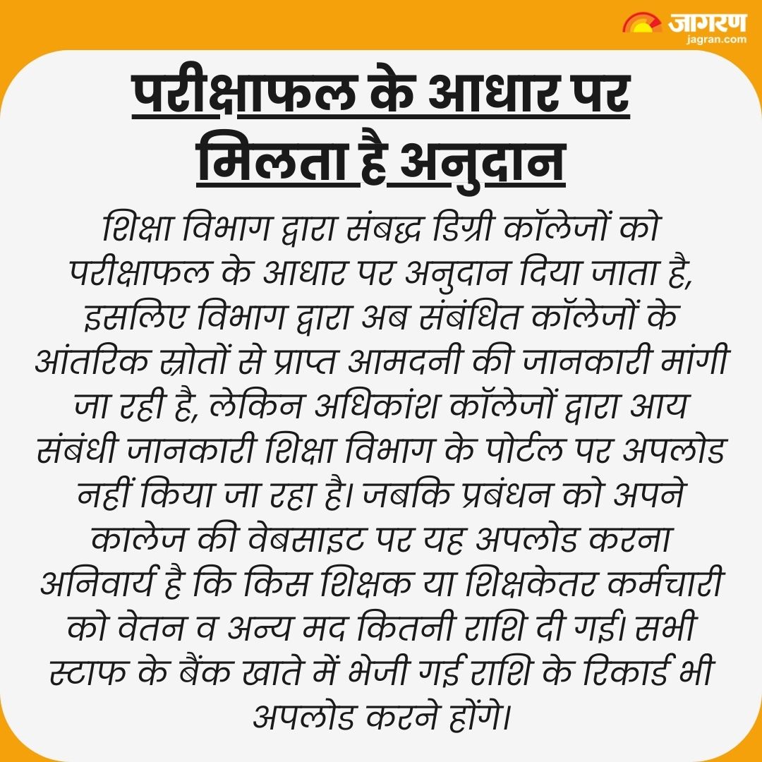 राज्य के 227 संबद्ध डिग्री कॉलेजों को अपनी आय के आंतरिक स्रोतों की जानकारी देनी होगी। शिक्षा विभाग ने उन कॉलेजों से पूछा है कि आंतरिक स्रोत से मिलने वाली राशि का 70 प्रतिशत हिस्सा शिक्षकों और कर्मियों के वेतन पर खर्च हो रहा है या नहीं। इसे कुलसचिवों, वित्तीय परामर्शियों एवं वित्त पदाधिकारियों के साथ होने वाली मासिक बैठक के एजेंडे में शामिल किया है। अनुदान राशि परीक्षाफल आधारित है और शिक्षा विभाग ने इसका उपयोगिता प्रमाण-पत्र सौंपने के साथ ही शिक्षकों-कर्मियों को भुगतेय राशि को भी एजेंडे में सम्मिलित किया है।