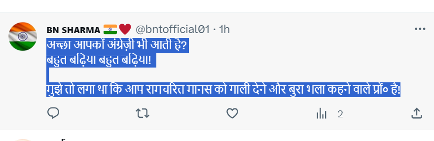 एक यूजर ने लिखा कि अच्छा आपको अंग्रेजी भी आती है? बहुत बढ़िया बहुत बढ़िया! मुझे तो लगा था कि आप रामचरित मानस को गाली देने और बुरा भला कहने वाले प्रोफेसर हैं।