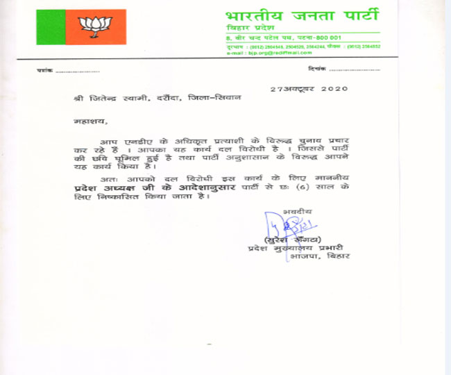 पटना, जागरण संवाददाता। Bihar Chunav 2020: बिहार चुनाव को लेकर हर पार्टी पूरी ताकत झोंक रही है। वहीं दूसरी तरफ भारतीय जनता पार्टी अपने बागियों से ही जूझ रही है। हालांकि पार्टी ने चुनाव के समय सख्त कार्रवाई कर यह संदेश देने की कोशिश की है कि ऐसी कोताही को बिल्कुल भी बर्दाश्त नहीं किया जाएगा। पार्टी ने छह और बागियों को पार्टी से बाहर निकाल दिया है। इसको लेकर पार्टी के प्रदेश मुख्यालय प्रभारी सुरेश रूंगटा ने आदेश जारी किया है।