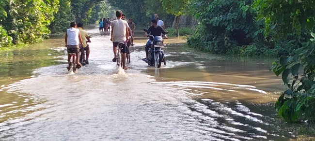 भागलपुर के गोसाईं गांव में सड़क पर बह रहा पानी।