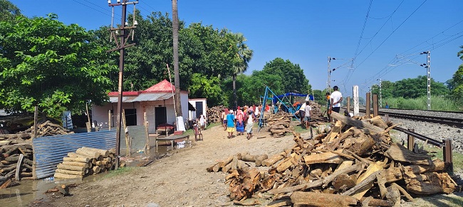 सारण के सेमरिया श्मशान घाट में बाढ़ का पानी भरने के कारण रेलवे लाइन के किनारे शवदाह के लिए सजी लकड़ी की दुकानें, शवदाह करने के लिए लोगों को नंबर आने का इंतजार करना पड़ रहा है।