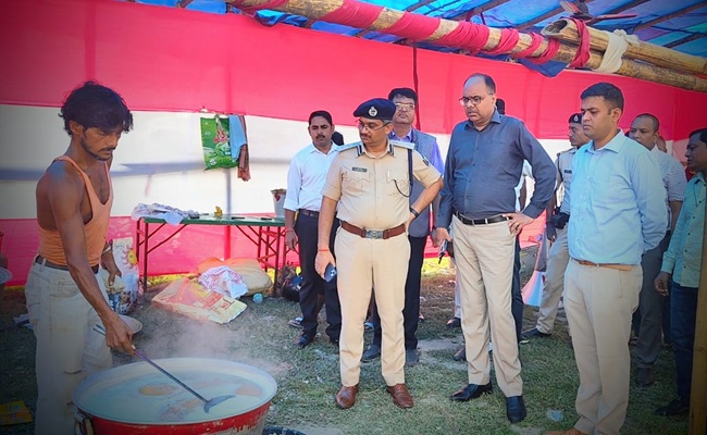 बाढ़ पीड़ितों के लिए राहत शिविर में भोजन की जानकारी लेते पटना के जिलाधिकारी डा. चंद्रशेखर सिंह और एसएसपी राजीव मिश्रा।