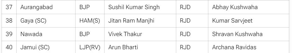 बिहार में जनता दल यूनाइडेट 15 सीटों पर लीड कर रही है। भारतीय जनता पार्टी 13 सीटों पर लीड कर रही है। लोजपा (रामविलास) 5 सीटों पर लीड कर रही है। राष्ट्रीय जनता दल 3 सीटों पर लीड कर रही है। सीपीआई-एमएल 2 सीटों पर लीड कर रही है। कांग्रेस और हिंदुस्तानी आवाम मोर्चा 1-1 सीट पर लीड कर रही है।