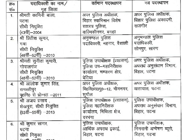कामिनी बाला को अपर पुलिस अधीक्षक विशेष स्वाभिमान विशेष सशस्त्र बल पुलिस बल बाल्मीकि नगर बगहा से अपर पुलिस अधीक्षक बनाकर बिहार पुलिस अकादमी राजगीर भेजा गया है। प्रितीश कुमार का तबादला महनार,अनुमंडल पुलिस पदाधिकारी सोनपुर सारण के तौर पर किया गया है। सुनीता कुमारी को अपर पुलिस अधीक्षक अपराध अनुसंधान विभाग पटना बनाया गया है।