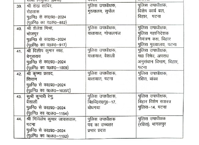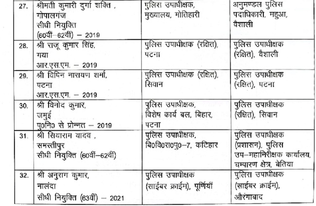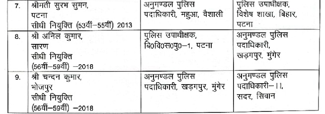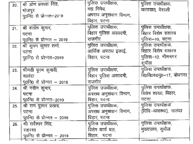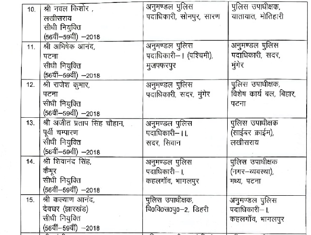 शिवानंद सिंह को पुलिस उपाधीक्षक नगर व्यवस्था मध्य पटना की जिम्मेदारी दी गई है। कल्याण आनंद को डिहरी से अनुमंडल पुलिस पदाधिकारी कहलगांव भागलपुर बनाया गया है। संजीव कुमार को पुलिस उपाधीक्षक विशेष शाखा बिहार पटना में बनाया गया है।