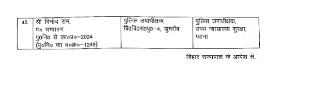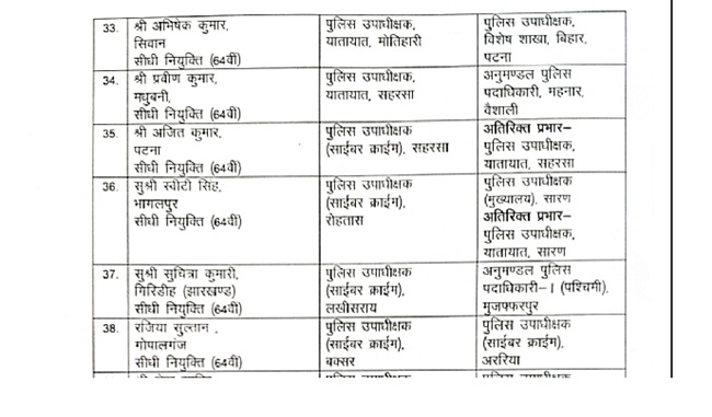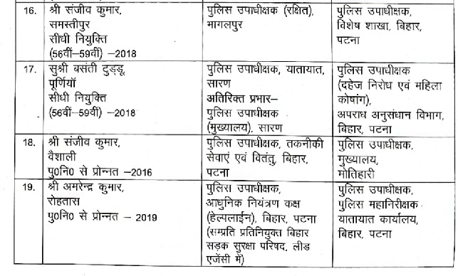 बसंती टुडू को सारण से पुलिस उपाधीक्षक दहेज निरोध एवं महिला कोषांग अपराध अनुसंधान विभाग बिहार पटना में भेजा गया है। संजीव कुमार को पुलिस उपाधीक्षक मुख्यालय मोतिहारी भेजा गया है। अमरेंद्र कुमार को बिहार भेजा गया है।