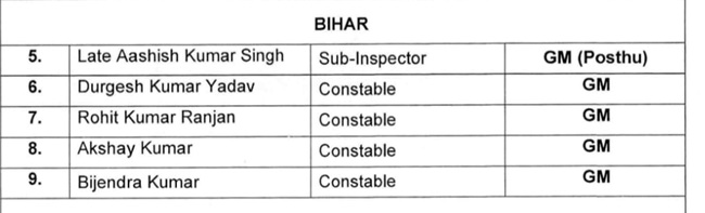 इन्हें मिला गैलेंट्री पदक : स्व. आशीष कुमार सिंह, दारोगा। दुर्गेश कुमार यादव, रोहित कुमार रंजन, अक्षय कुमार और बिजेंद्र कुमार (सभी सिपाही)।