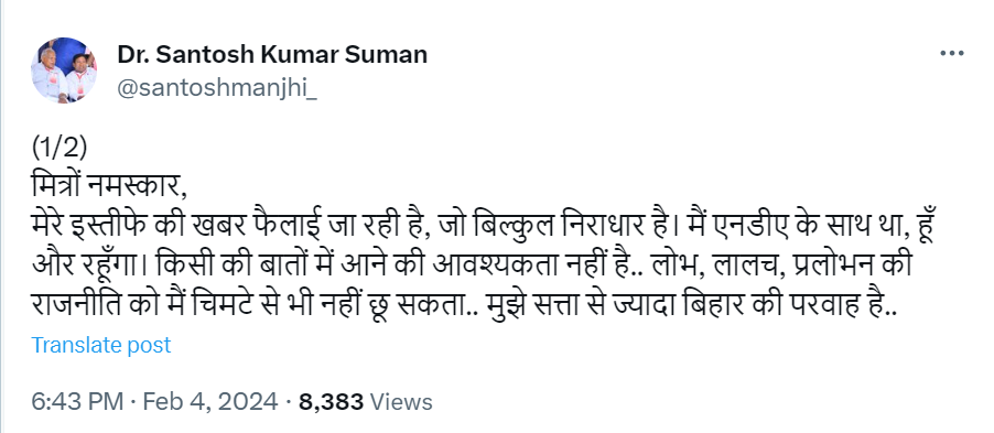 Santosh Kumar Suman बिहार सरकार में मंत्री संतोष कुमार सुमन ने एक्स पर पोस्ट डाल कर स्थिति स्पष्ट की और इस्तीफे को पूरी तरह से अफवाह बताया। उन्होंने अपनी पोस्ट में लिखा कि मेरे इस्तीफे की खबर फैलाई जा रही है जो बिल्कुल निराधार है। मैं एनडीए के साथ था और रहूंगा। किसी की बातों में आने की आवश्यकता नहीं।