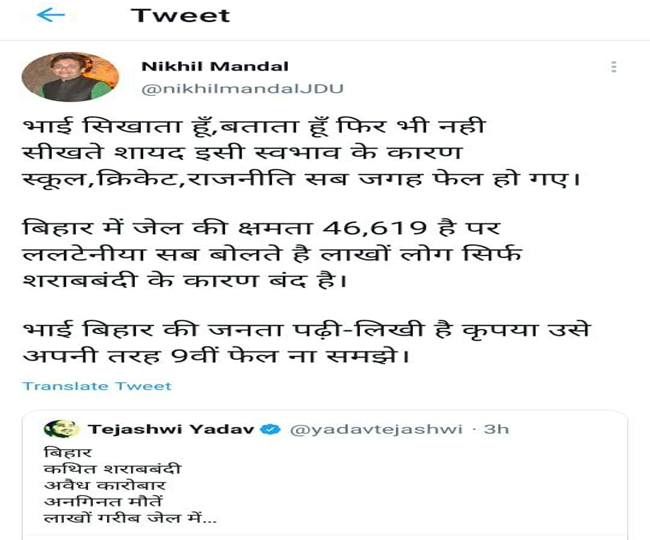 शनिवार को तेजस्वी यादव ने अखबार की कतरन साझा करते हुए ट्विटर पर लिखा, बिहार कथित शराबबंदी, अवैध कारोबार, अनगिनत मौतें, लाखों गरीब जेल में मुख्यमंत्री माफिया के साथ मौज में। नेता प्रतिपक्ष के इस ट्वीट पर जवाब देते हुए जदूय प्रवक्ता निखिल मंडल ने कहा कि भाई सिखाता हूं, बताता हूं, फिर भी नहीं सीखते। शायद इसी स्वभाव के कारण स्कूल, क्रिकेट, राजनीति सब जगह फेल हो गए। बिहार में जेल की क्षमता 46,619 है पर ललटेनीया सब बोलते हैं लाखों लोग सिर्फ शराबबंदी के कारण बंद हैं। भाई बिहार की जनता पढ़ी-लिखी है कृपया उसे अपनी तरह 9वीं फेल ना समझें।