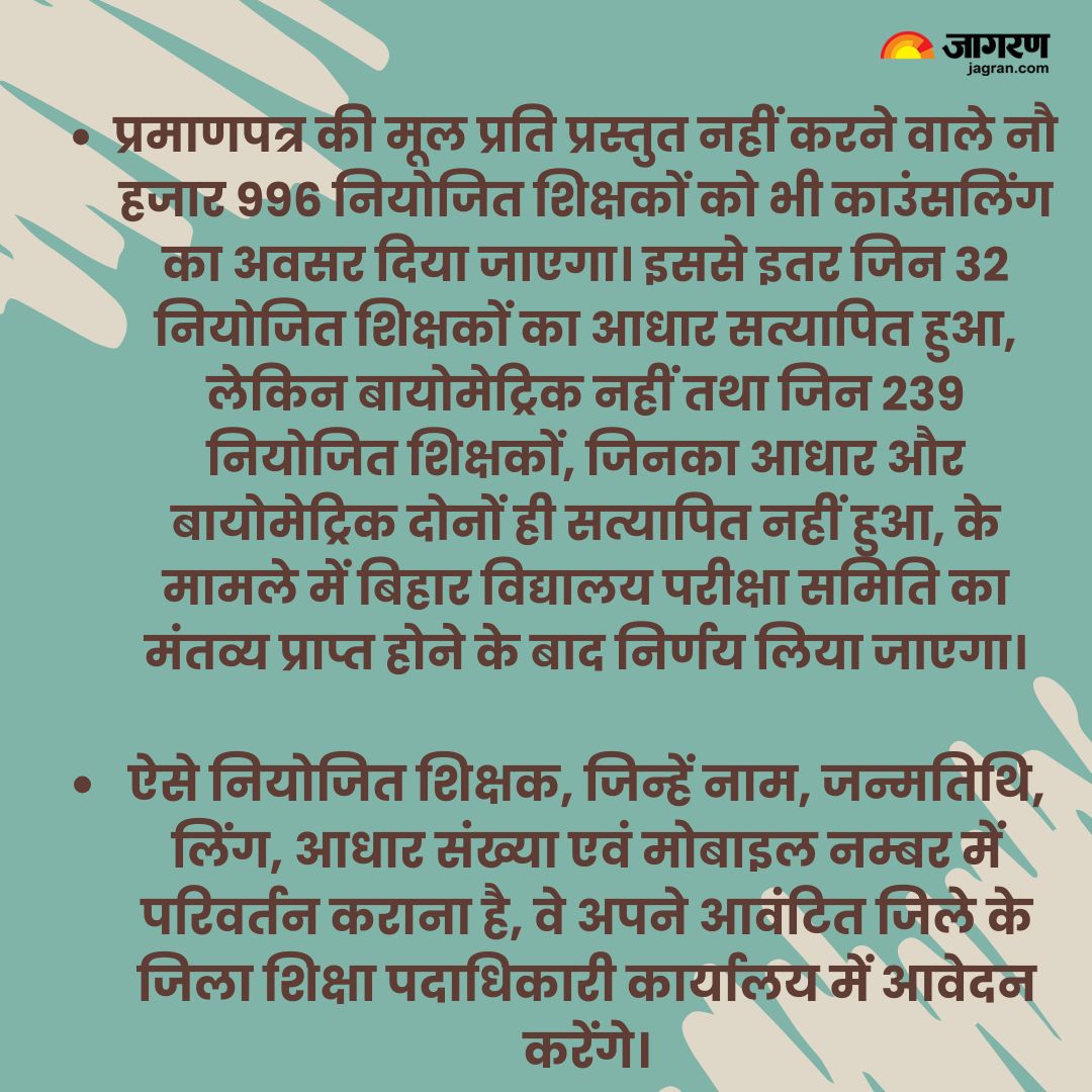 दूसरी ओर जिन 23 हजार 801 नियोजित शिक्षकों के एक या एक से अधिक सर्टिफिकेट संदिग्ध पाए गए हैं, के सही प्रमाणपत्र अपलोड करने के लिए बिहार विद्यालय परीक्षा समिति द्वारा सॉफ्टवेयर में विकल्प प्रदान किया जाएगा। हालांकि, संबंधित शिक्षकों द्वारा पूर्व में अपलोड किया गया प्रमाणपत्र यथावत रहेगा, ताकि शिक्षकों द्वारा अपलोड किए गए दोनों प्रमाणपत्रों का आवश्यकतानुसार अवलोकन किया जा सके।
