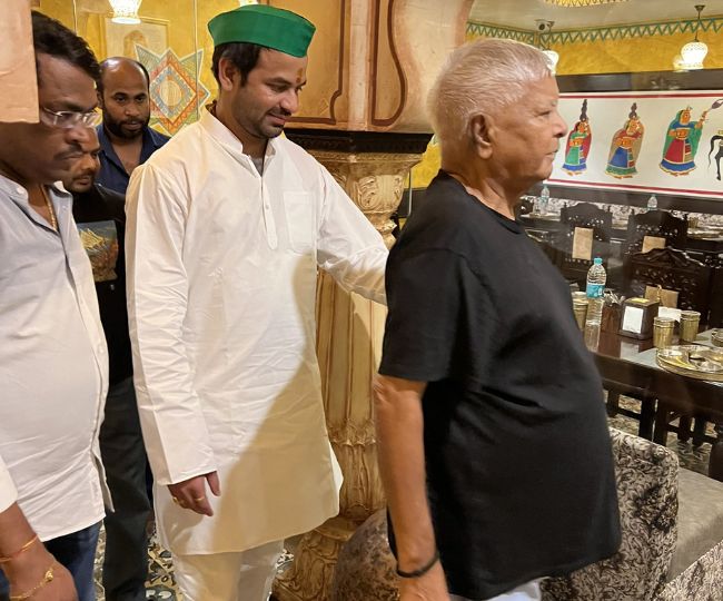 एक्स पर शेयर फोटो में तेज प्रताप यादव जहां बाकायदा कुर्ते में नजर आ रहे हैं, वहीं लालू यादव लोअर और ब्लैक टीशर्ट में नजर आ रहे हैं। होटल में बैठे पिता-पुत्र दोनों के सामने दो बड़ी राजस्थानी थाली नजर आ रही है। हालांकि उसमें भोजन नहीं परोसा गया है। पिता के साथ बैठे तेज प्रताप यादव काफी उत्साहित दिखाई दिए।