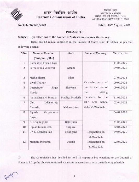 आयोग के अनुसार, मीसा भारती और विवेक ठाकुर के लोकसभा सदस्य बन जाने के कारण राज्यसभा की दोनों सीटें रिक्त हुईं थी। खाली हुईं इन सीटों पर तीन सितंबर को चुनाव होंगे।