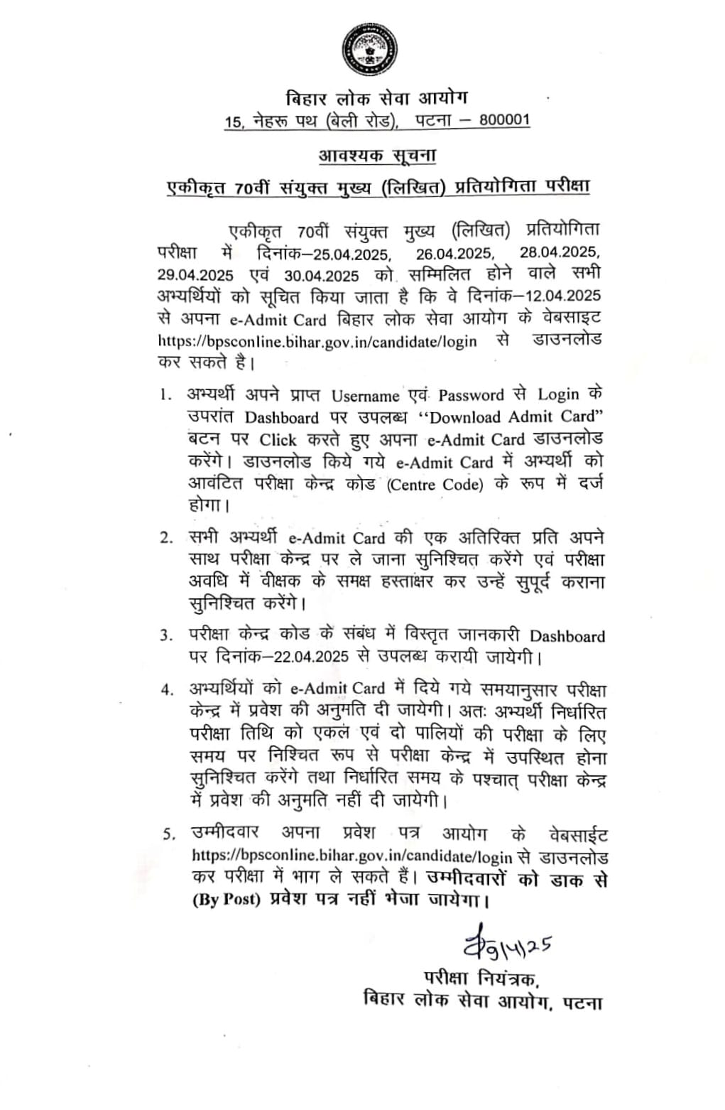 बिहार लोक सेवा आयोग ने 70वीं मुख्य परीक्षा का शेड्यूल जारी किया है। परीक्षा 25 से 30 अप्रैल 2025 तक होगी। एडमिट कार्ड 12 अप्रैल को जारी होगा जिसे उम्मीदवार आयोग की वेबसाइट से डाउनलोड कर सकते हैं। उम्मीदवारों को परीक्षा केंद्र का कोड 22 अप्रैल से डैशबोर्ड पर मिलेगा। परीक्षा केंद्र में समय से पहुंचना अनिवार्य है और प्रवेश पत्र डाक से नहीं भेजे जाएंगे।