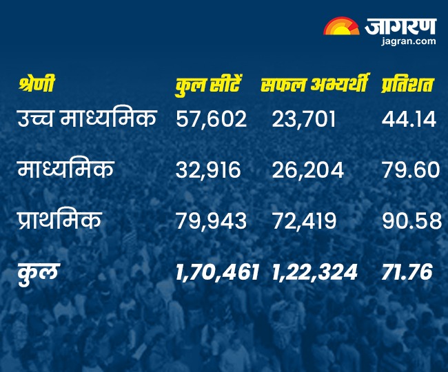 माध्यमिक (कक्षा नौ व 10वीं) के 32 हजार 916 सीटों के विरुद्ध 26 हजार 89 अभ्यर्थियों को सफल घोषित किया गया है। माध्यमिक में 79.25 प्रतिशत सीटों पर योग्य अभ्यर्थी मिले हैं।