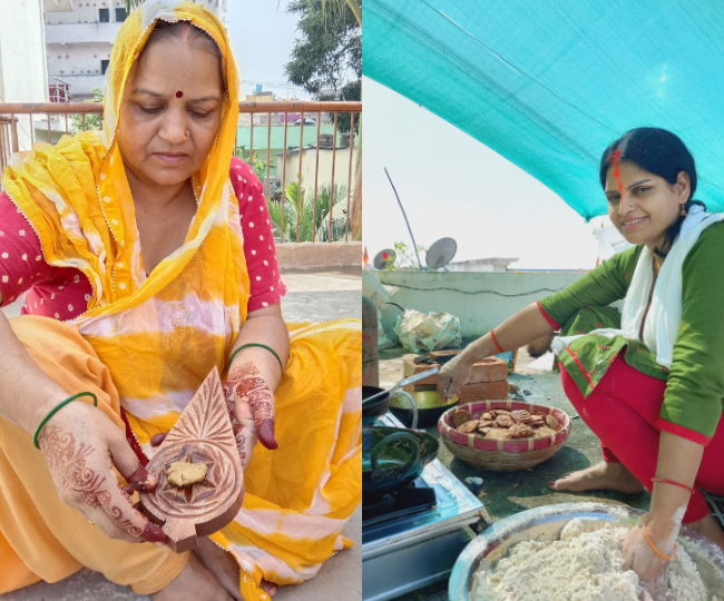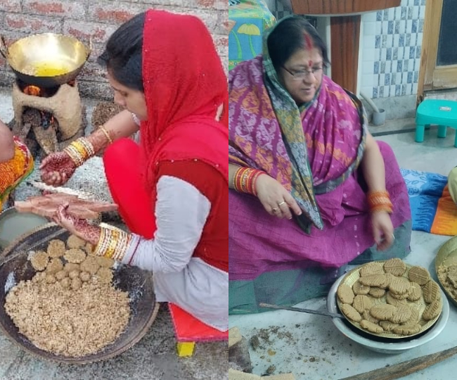 छठ का प्रसाद ठेकुआ बनातीं छठ व्रती।
