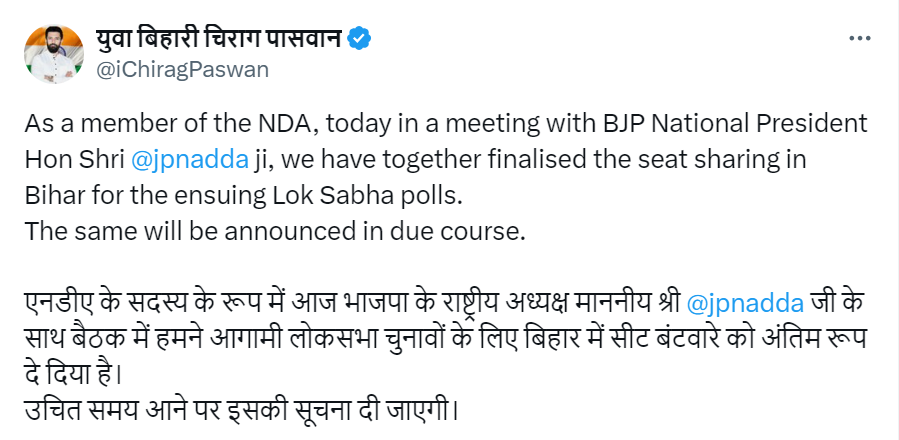 उन्होंने लिखा, एनडीए के सदस्य के रूप में आज भाजपा के राष्ट्रीय अध्यक्ष जेपी नड्डा जी के साथ बैठक में हमने आगामी लोकसभा चुनावों के लिए बिहार में सीट बंटवारे को अंतिम रूप दे दिया है। उचित समय आने पर इसकी सूचना दी जाएगी।