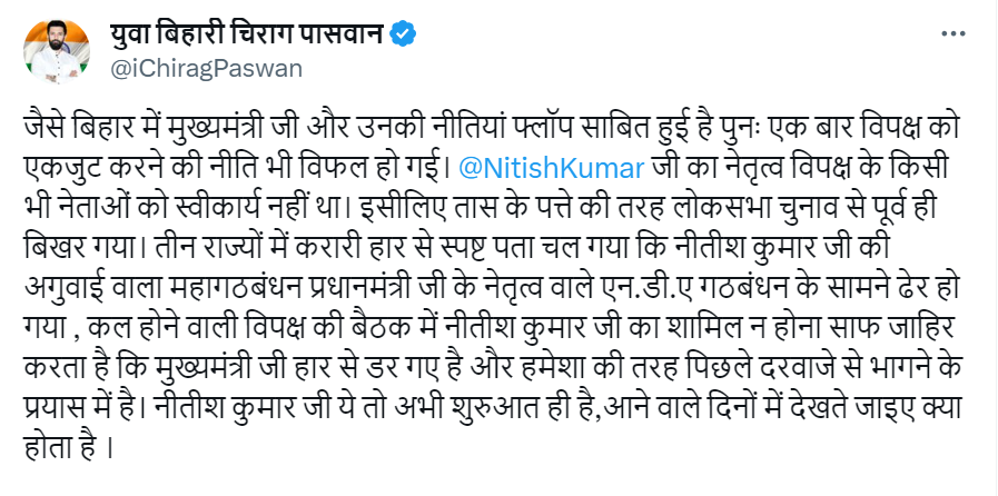 Chirag Paswan: 'मेरे मुख्यमंत्री पिछले दरवाजे से...', पासवान ने बताया- I.N.D.I.A की बैठक से क्यों दूरी बना रहे Nitish Kumar?