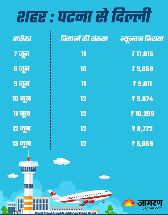 ऐसा ही कुछ हाल दिल्ली जानेवाली विमानों के किराए का है। पहले जहां पटना से दिल्ली के फ्लाइट टिकट 3 से 4 हजार के बीच मिल जाते थे, तो अब इसके दाम तीन गुणा तक बढ़ गए हैं। 7 जून को टिकट का दाम 11,815 रुपये है। 11 जून के लिए 10 हजार रुपये में टिकट मिल रहे हैं।