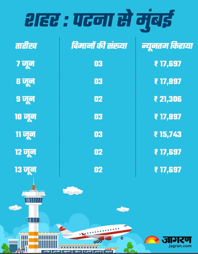 वहीं, मुबंई का किराया भी आसमान छू रहा है। इसका अंदाजा इसी से लगाया जा सकता है कि मुंबई के टिकट का न्यूनतम किराया ही 15 हजार रुपये है। 9 जून को टिकट का दाम 21 हजार के ऊपर है।