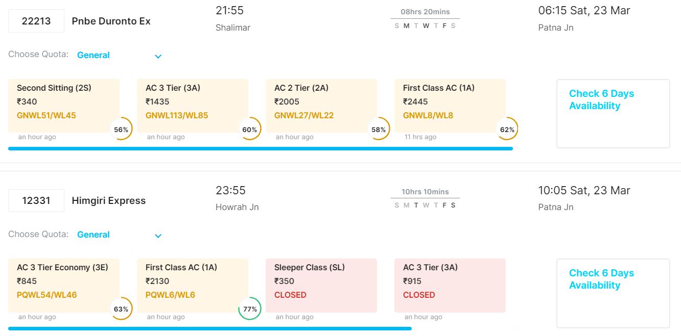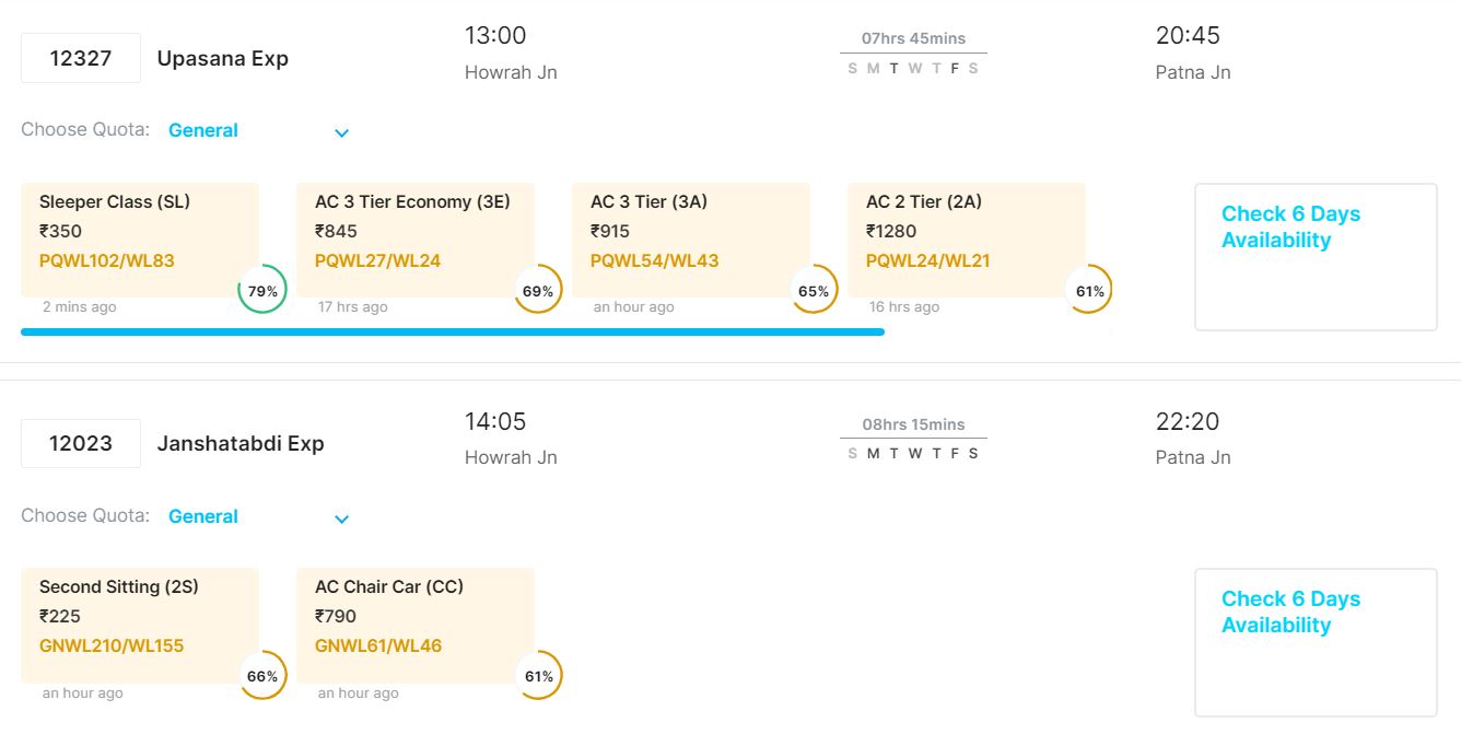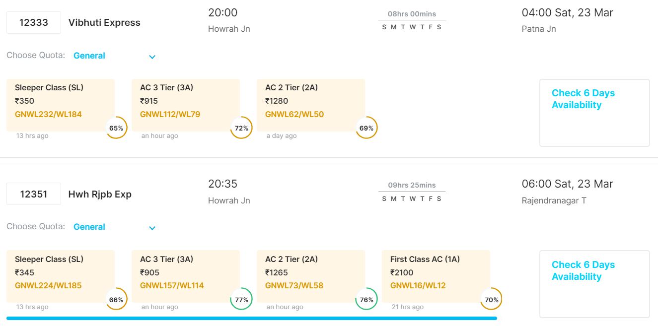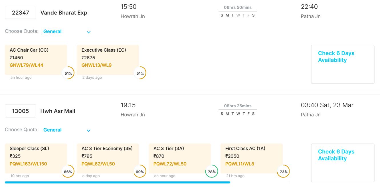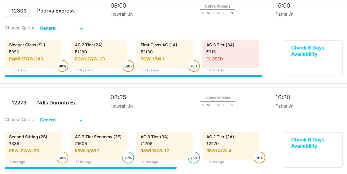 होली (Howrah-Patna Holi Special) के सीजन को देखते हुए ट्रेनों में सीट मिलना मुश्किल हो गया है। इस वक्त जितने भी रिजर्वेशन हो रहे हैं सभी वेटिंग लिस्ट के तहत हो रहे हैं। सुबह आठ बजे हावड़ा से चलकर शाम के चार बजे पटना पहुंचने वाली पूर्वा एक्सप्रेस (Poorva Express) के स्लीपर कोच में 143 वेटिंग है, जबकि 3 टियर में बुकिंग बंद हो चुकी है। 2 टियर और फर्स्ट क्लास श्रेणी में क्रमश: 23 और एक वेटिंग है।