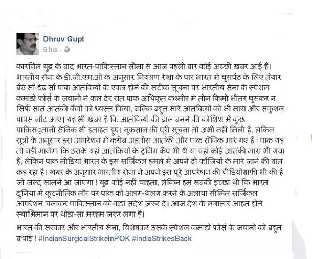 पूर्व आइपीएस अधिकारी व सोशल मीडिया पर एक्टिव ध्रुव गुप्त ने फेसबुक पर लिखा है, ''कारगिल युद्ध के बाद भारत-पाकिस्तान सीमा से आज पहली बार कोई अच्छी खबर आई है। ...पाक यह तो नहीं मानेगा कि उसके यहां आतंकियों के ट्रेनिंग कैंप भी थे या वहां कोई आतंकी मारा भी गया है, लेकिन पाक मीडिया भारत के इस सर्जिकल हमले में अपने दो फौजियों के मारे जाने की बात कह रहा है।''