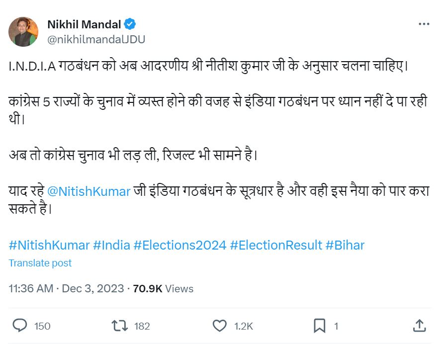 इस बीच नीतीश कुमार की पार्टी के नेता ने तीन राज्यों में चुनाव हारने पर कांग्रेस को नसीहत दे डाली है। जदयू के प्रदेश महासचिव निखिल मंडल ने अपने एक्स हैंडल पर लिखा कि आईएनडीआईए को अब नीतीश कुमार के अनुसार चलना चाहिए।