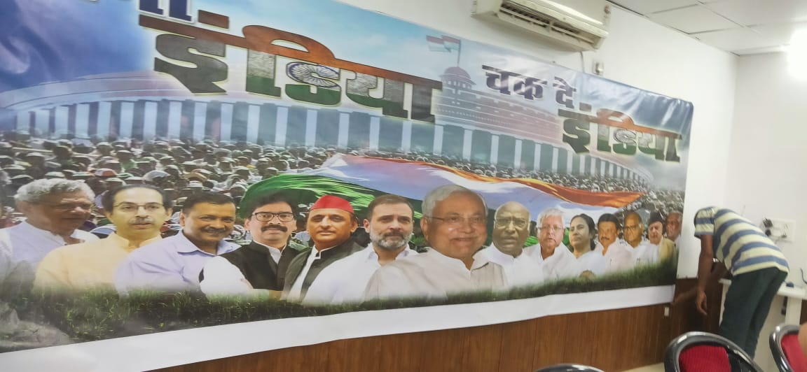 I.N.D.I.A के पोस्टर के बैकग्राउंड में संसद की तस्वीर लगी नजर आ रही थी, जबकि पोस्टर के सेंटर में बिहार के मुख्यमंत्री नीतीश कुमार था, जिनके बाईं ओर कांग्रेस के पूर्व अध्यक्ष राहुल गांधी और दाईं ओर कांग्रेस के राष्ट्रीय अध्यक्ष मल्लिकार्जुन खड़गे थे। इनके आसपास गठबंधन के अन्य नेताओं की तस्वीरें लगी थीं।
