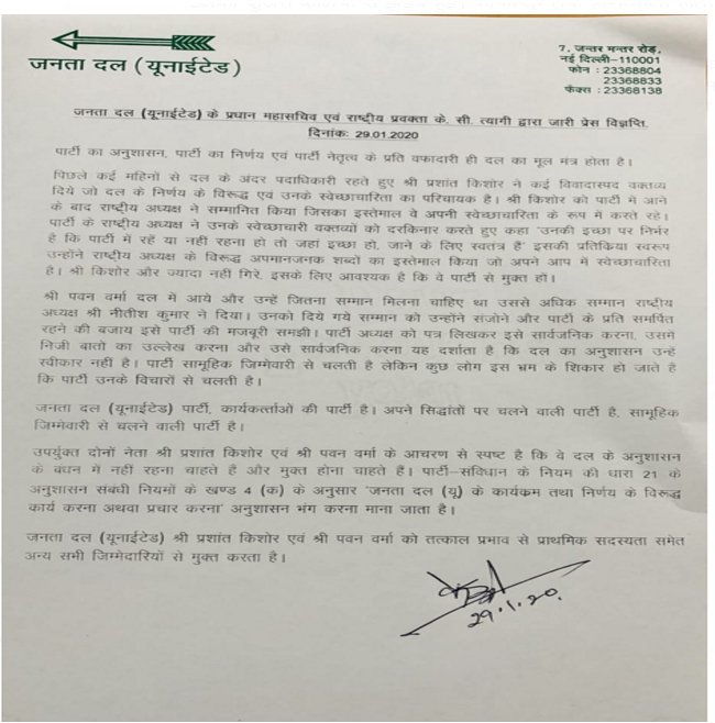 पटना, जेएनएन। पार्टी लाइन से बाहर जाकर बयान देने वाले बागी नेताओं, पवन वर्मा और प्रशांत किशोर को जदयू ने पार्टी से बाहर निकाल दिया है। दोनों पर जदयू ने कार्रवाई करते हुए दोनों को पार्टी से बर्खास्त कर दोनों को पार्टी की सभी जिम्मेदारियों से भी मुक्त कर दिया है। सीएए, एनआरसी और दिल्ली विधानसभा चुनाव में भाजपा के साथ गठबंधन को लेकर प्रशांत किशोर और पवन वर्मा पार्टी लाइन से बाहर जाकर बयान दे रहे थे, जिसके कारण पार्टी ने दोनों नेताओं पर ये बड़ी कार्रवाई की है। औपचारिक रूप से प्रेस रिलीज जारी कर जदयू ने इसकी सूचना दी है।