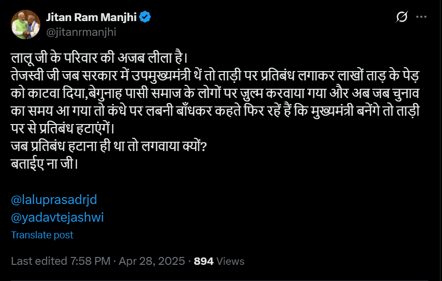 केंद्रीय मंत्री जीतन राम मांझी ने ताड़ी के बहाने तेजस्वी यादव (Tejashwi Yadav) पर जुबानी हमला बोला है। मांझी ने एक्स पर लिखा- लालू जी के परिवार की अजब लीला है। तेजस्वी जब सरकार में उपमुख्यमंत्री थे तो ताड़ी पर प्रतिबंध लगाकर लाखों ताड़ के पेड़ को कटवा दिया।