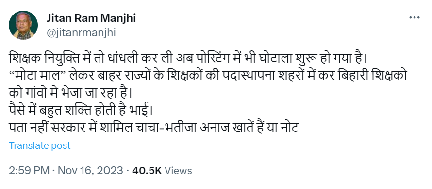 बिहार के पूर्व मुख्यमंत्री जीतन राम मांझी ने एक्स पर लिखा, "शिक्षक नियुक्ति में तो धांधली कर ली अब पोस्टिंग में भी घोटाला शुरू हो गया है। 'मोटा माल' लेकर बाहरी राज्यों के शिक्षकों की पदास्थापना शहरों में कर बिहारी शिक्षकों को गांवों मे भेजा जा रहा है।"