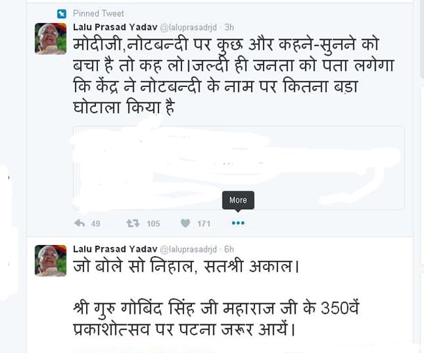 लालू प्रसाद ने अपने एक ट्वीट में गुरु गोविंद सिंह महाराज के 350वें प्रकाशोत्सव पर लोगों को पटना आने का आमंत्रण भी दिया है।