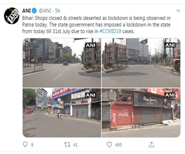 पटना, स्टेट ब्यूरो/ एएनआइ। Lockdown Again Bihar: कोरोना संक्रमण की विस्फोटक स्थिति को देखते हुए बिहार में गुरुवार से फिर 15 दिनों को पूर्ण लॉकडाउन लागू कर दिया गया है। गुरुवार को इसके पहले दिन सड़कों पर सन्नाटा पसरा दिखा। 31 जुलाई तक लागू इस लॉकडाउन के दौरान पूरी सख्ती बरती जाएगी। अनावश्यक सड़क पर निकले लोगों के वाहन जब्त होंगे तो बिना मास्क पकड़े जाने पर जुर्माना भी भरना पड़ेगा।