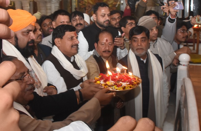 इस्कान मंदिर में भगवान के दर्शन के दौरान राधा कृष्णा की आरती करते मध्य प्रदेश के मुख्यमंत्री डॉ. मोहन यादव साथ में प्रदेश अध्यक्ष सम्राट चौधरी प्रतिपक्ष के नेता विजय कुमार सिन्हा सांसद राम कृपाल यादव विधायक नन्द किशोर यादव। फोटो- जागरण
