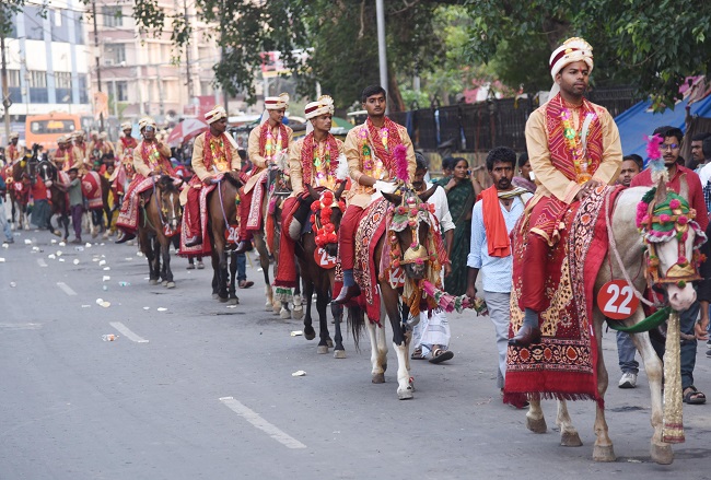एक विवाह ऐसा भी के 13वें संस्करण के तहत आयोजित सामूहिक विवाह के लिए सुबह 51 दूल्हों की सामूहिक बरात शहर के महाराणा प्रताप भवन से गाजे-बाजे, घोड़े-ऊंट के साथ निकलकर श्रीकृष्ण मेमोरियल पहुंची।