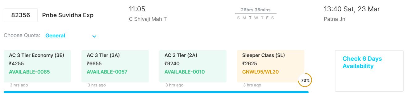 होली के सीजन के चलते ट्रेनों में धड़ाधड़ बुकिंग हो रही है। इस दौरान मुंबई से पटना जाने वाली सभी ट्रेनों में अभी वेटिंग लिस्ट के तहत रिजर्वेशन हो रहा है। एक ऑनलाइन प्लेटफार्म से ली गई जानकारी के मुताबिक, छत्रपति शिवाजी महाराज टर्मिनस से चलकर पटना जंक्शन को जाने वाली सुविधा एक्सप्रेस के 3 टियर इकोनॉमी में 85 वेटिंग चल रही है। वहीं 3 टियर, 2 टियर और स्लीपर कोच में क्रमश: 57, 10 व 20 की वेटिंग चल रही है। इसी तरह से पाटलीपुत्र, गुवाहाटी व पटना एक्सप्रेस की स्थिति भी कुछ ऐसी ही है।