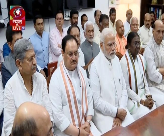 बाएं से ललन सिंह, जेपी नड्डा, पीएम नरेन्द्र मोदी, द्रौपदी मुर्मू और राजनाथ सिंह। साभारः ट्विटर।
