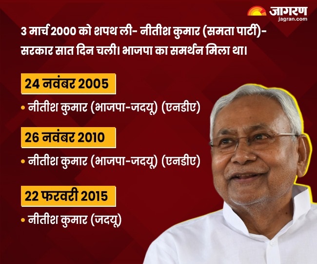 - पहली बार नीतीश 3 मार्च 2000 को शपथ लेकर मुख्यमंत्री बने। उस वक्त नीतीश समता पार्टी में थे। यह सरकार महज सात दिन ही चली। इस दौरान भाजाप का समर्थन उन्हें हासिल हुआ था।