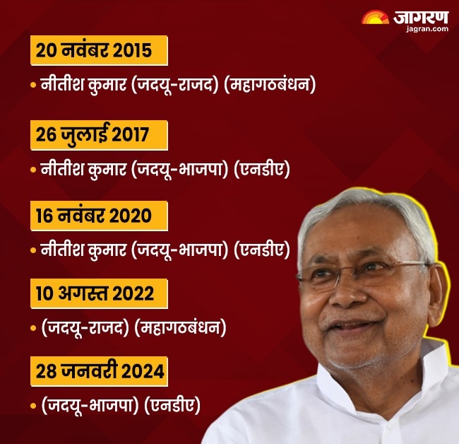 प्रदेश में एक दिन पहले तक जदयू और राजद के महागठबंधन वाली सरकार थी। परंतु, अब जदयू और भाजपा के गठबंधन वाली सरकार है। नीतीश कुमार नई सरकार के मुखिया के तौर पर शपथ भी ले चुके हैं। ऐसे में अब यह जानना रोचक है कि नीतीश ने कब किस दल के साथ गठबंधन में सरकार बनाई और मुख्यमंत्री पद की शपथ ली है।