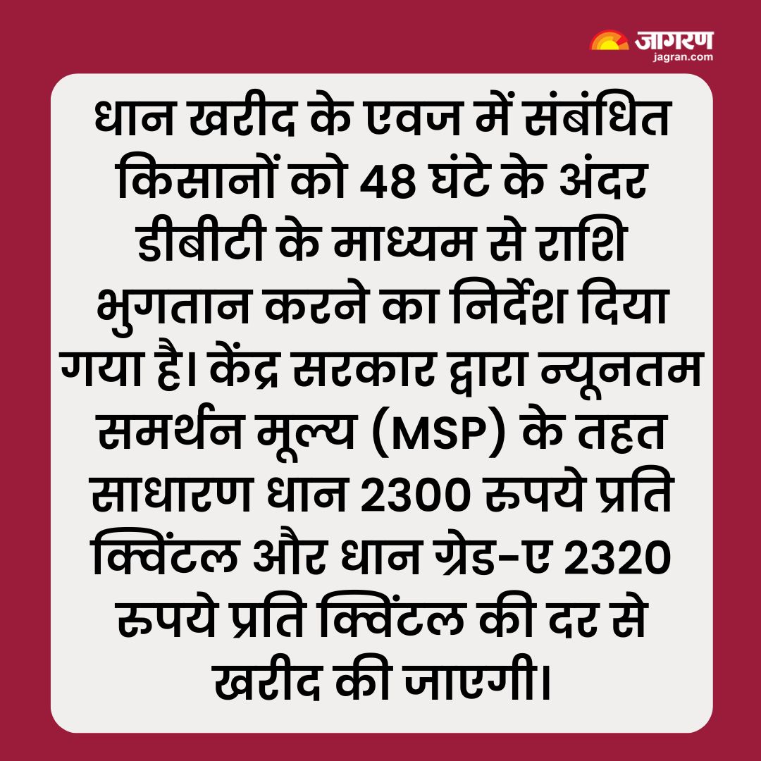 15 नवंबर से राज्य के शेष जिलों में धान खरीद आरंभ होगी। सरकार द्वारा धान खरीद की अंतिम तिथि 15 फरवरी, 2025 तय की गई है। इस वर्ष 45 लाख टन धान और 30 लाख टन उसना चावल की खरीद का लक्ष्य रखा गया है।