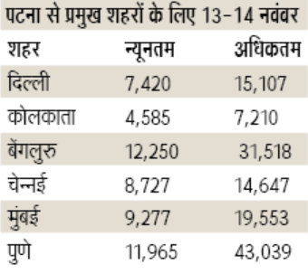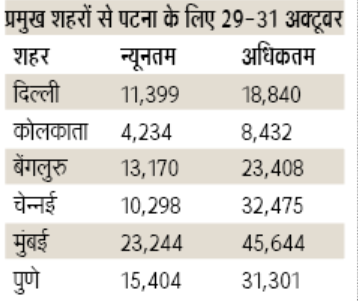 त्योहार के मौसम में विमानों का किराया आसमान छूने लगा है। टिकटों के दाम तीन से पांच गुना तक पहुंच गए हैं। वर्तमान में 72 विमानों का परिचालन पटना एयरपोर्ट से हो रहा है। जानकार बताते हैं कि तकनीकी कमियों की वजह से रात में पटना एयरपोर्ट पर विमान की लैंडिंग सुरक्षित नहीं है। अब दिन छोटे होने लगे हैं।