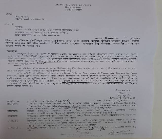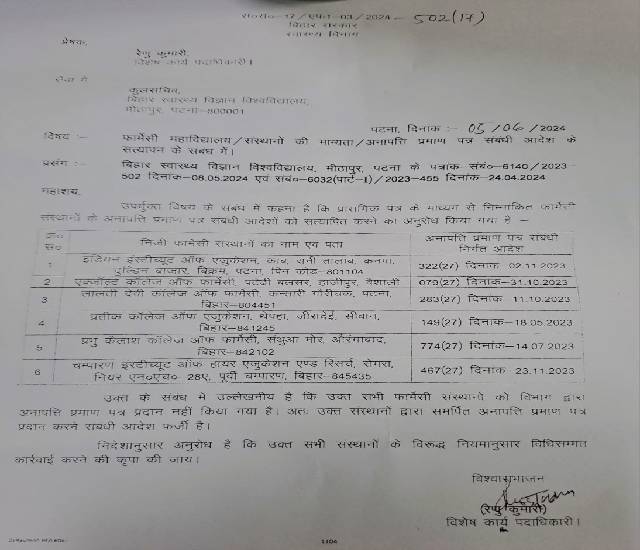 स्वास्थ्य विभाग में निजी कॉलेजों की संबद्धता के लिए अलग-अलग प्रशाखा है। फार्मेसी कॉलेजों की संबद्धता संबंधित अनापत्ति के संबंध में कार्यपालक पदाधिकारी रेणु कुमारी के कार्यालय से सूचना मांगी गई। इस पर स्वास्थ्य विभाग के अपर निदेशक सह लोक सूचना पदाधिकारी अलका सिन्हा ने जानकारी दी कि स्वास्थ्य विभाग के ज्ञापांक 17/ एफ-1-09/2023/322 (27) दिनांक 02 नवंबर 2023 का पत्र फर्जी है।