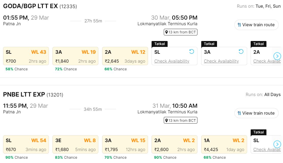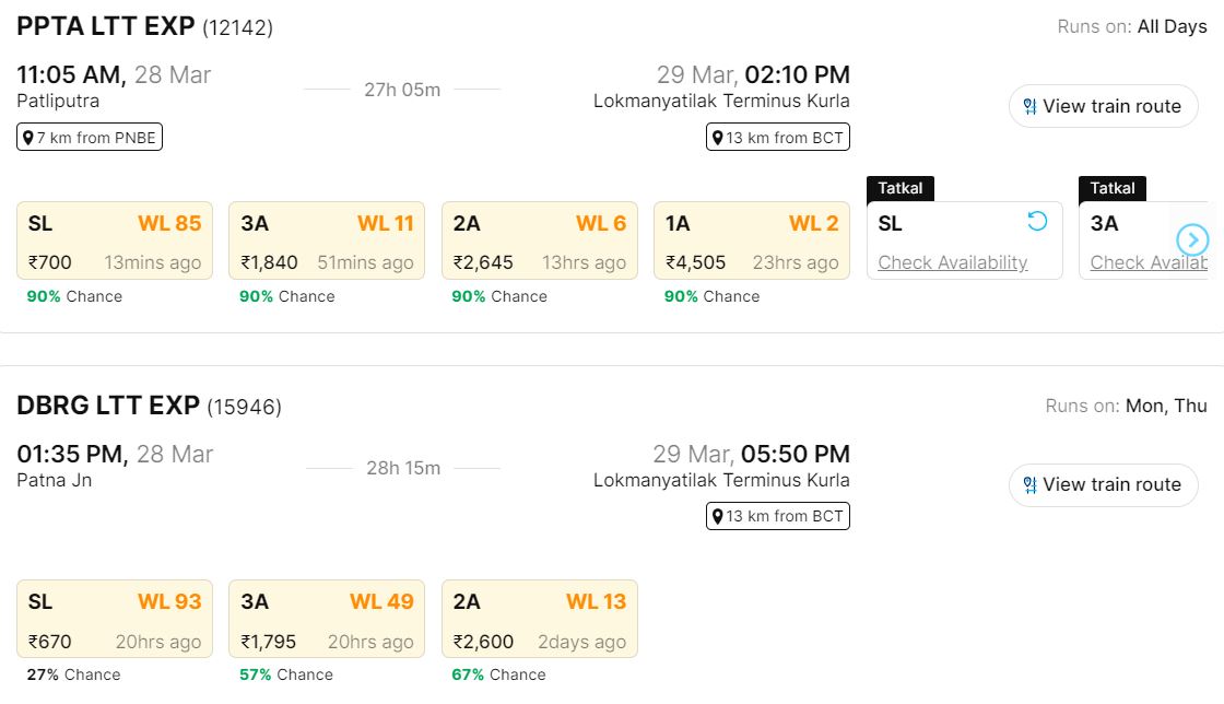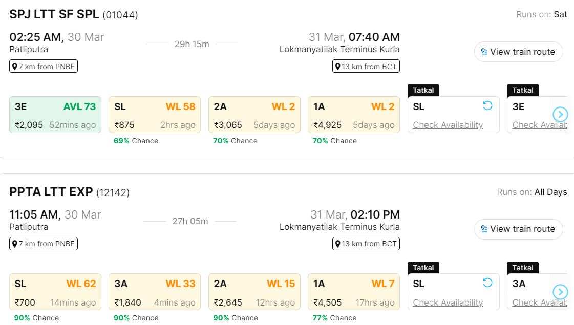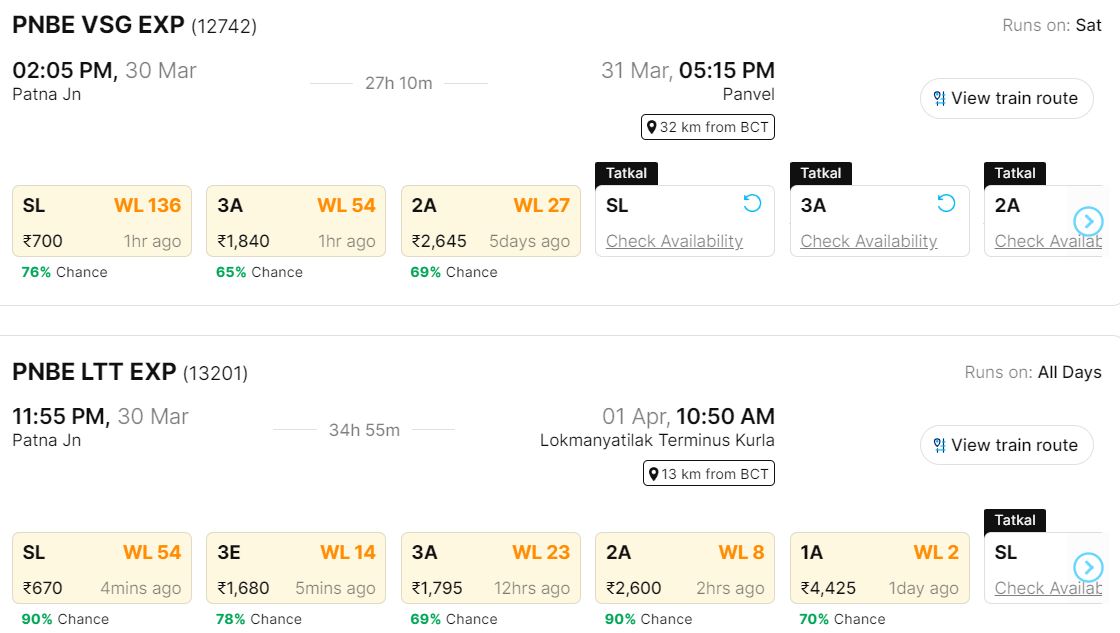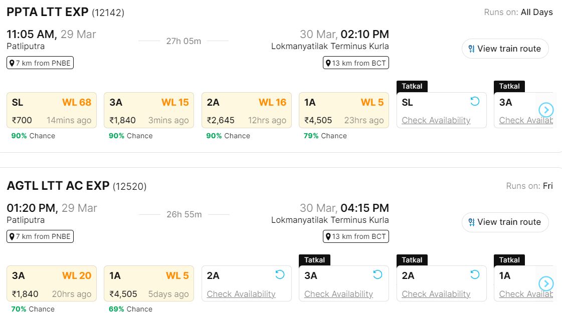 डिजिटल डेस्क, पटना। होली का त्योहार खत्म हो गया है। परिवार के साथ रंगों के इस उत्सव को मनाने के बाद लोग अब रोजी-रोटी के लिए दूसरे शहरों में वापसी करने लगे हैं। ऐसे में ट्रेनों में सीटें फटाफट भरती जा रही हैं। आज हम आपको पटना से मुंबई जाने वाली ट्रेनों में वेटिंग की ताजा स्थिति के बारे में बताने जा रहे हैं ताकि सीट बुक कराते वक्त आपको थोड़ी सहूलियत हो।