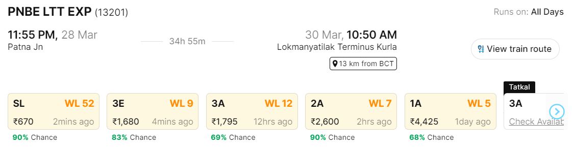 पटना से मुंबई को बीच कई सारी ट्रेनों की सुविधा है। हालांकि, त्योहारी सीजन को देखते हुए सीट मिलने में थोड़ी दिक्कत आ सकती है। हालांकि, राहत की बात यह है कि कई ट्रेनों में सीटें अब भी खाली हैं, जिनमें रिजर्वेशन कर आप आरामदायक स्थिति में यात्रा कर सकते हैं। हम आपको 28 मार्च से 31 मार्च तक दोनों शहरों के बीच चलने वाली ट्रेनों में वेटिंग की ताजा स्थिति बताने जा रहे हैं। यह जानकारी एक ऑनलाइन प्लेटफॉर्म से ली गई है।