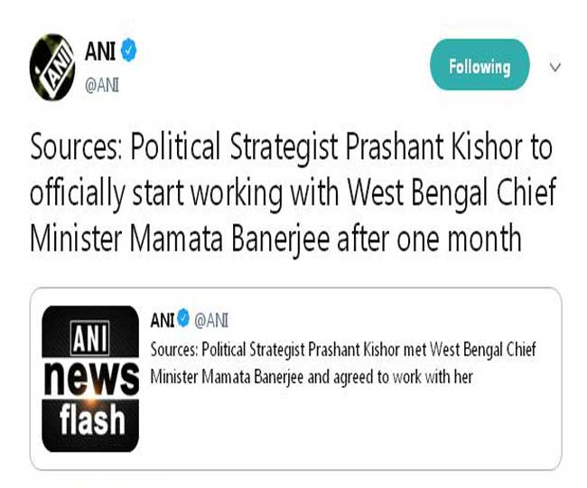 लोकसभा चुनाव से ठीक पहले ही पीके का जदयू से अलगाव हो गया था। चुनाव भर वे आंध्र प्रदेश में सक्रिय रहे, जहां उनकी एजेंसी वाइएसआर कांग्रेस के लिए काम कर रही थी। आंध्र में विधानसभा के अलावा लोकसभा में भी वाइएसआर कांग्रेस को शानदार कामयाबी हासिल हुई। चुनाव परिणाम के बाद जगन रेडडी ने पीके के प्रति आभार व्यक्त किया था। पिता के निधन के कारण पीके पिछले कुछ दिनों से पारिवारिक कार्यक्रम में व्यस्त थे। गुरुवार को ममता बनर्जी से मुलाकात के बाद चर्चा में आ गए।