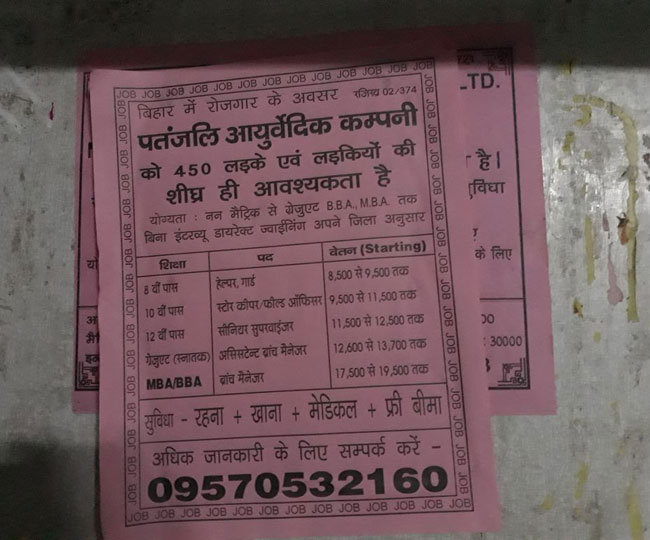 सुबह के 10.30 बजे हैं। मैं हूं मुजफ्फरपुर से पटना जा रही मेमू ट्रेन में। यहां बोगी में पीले रंग के पोस्टर सटे हैं। बिहार में रोजगार के अवसर। एक आयुर्वेदिक कंपनी के नाम से जारी पोस्टर में आठवीं पास हेल्पर एवं गार्ड, सैलरी 9000 से 10000। दसवीं पास स्टोर कीपर एवं फील्ड ऑफिसर, सैलरी 10500 से 12000 तक। बारहवीं पास सीनियर सुपरवाइजर, सैलरी 13000 से 14000 तक। स्नातक असिस्टेंट ब्रांच मैनेजर, सैलरी 14000 से 15500 तक। एमबीए एवं बीबीए ब्रांच मैनेजर, सैलरी 17000 से 18500 तक।