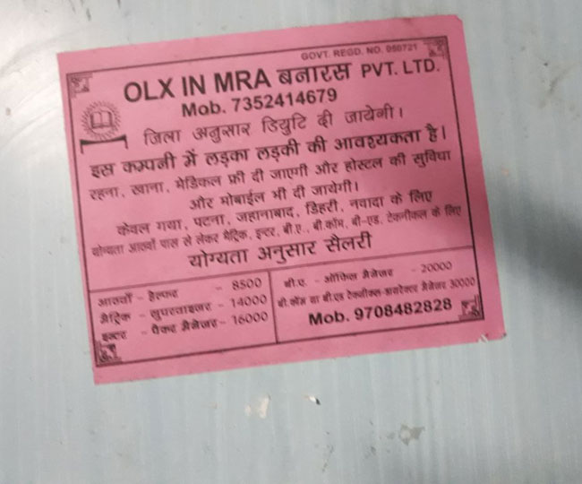 इतना ही नहीं साथ में रहना, खाना, मेडिकल फ्री। हॉस्टल एवं मोबाइल की सुविधा भी। जिला के अनुसार ड्यूटी दी जाएगी। केवल गया, पटना, जहानाबाद, डिहरी एवं नवादा के लिए। हद तो यह है कि पोस्टर पर सरकार का रजिस्टर्ड नंबर भी लिखा है। पोस्टर पर दो मोबाइल नंबर भी दिए गए हैं। इसी तरह के और भी कई आकर्षक पोस्टर। हद तो यह है कि पूरी ट्रेन में एक-दो नहीं, हजारों ऐसे पोस्टर सटे दिखे।